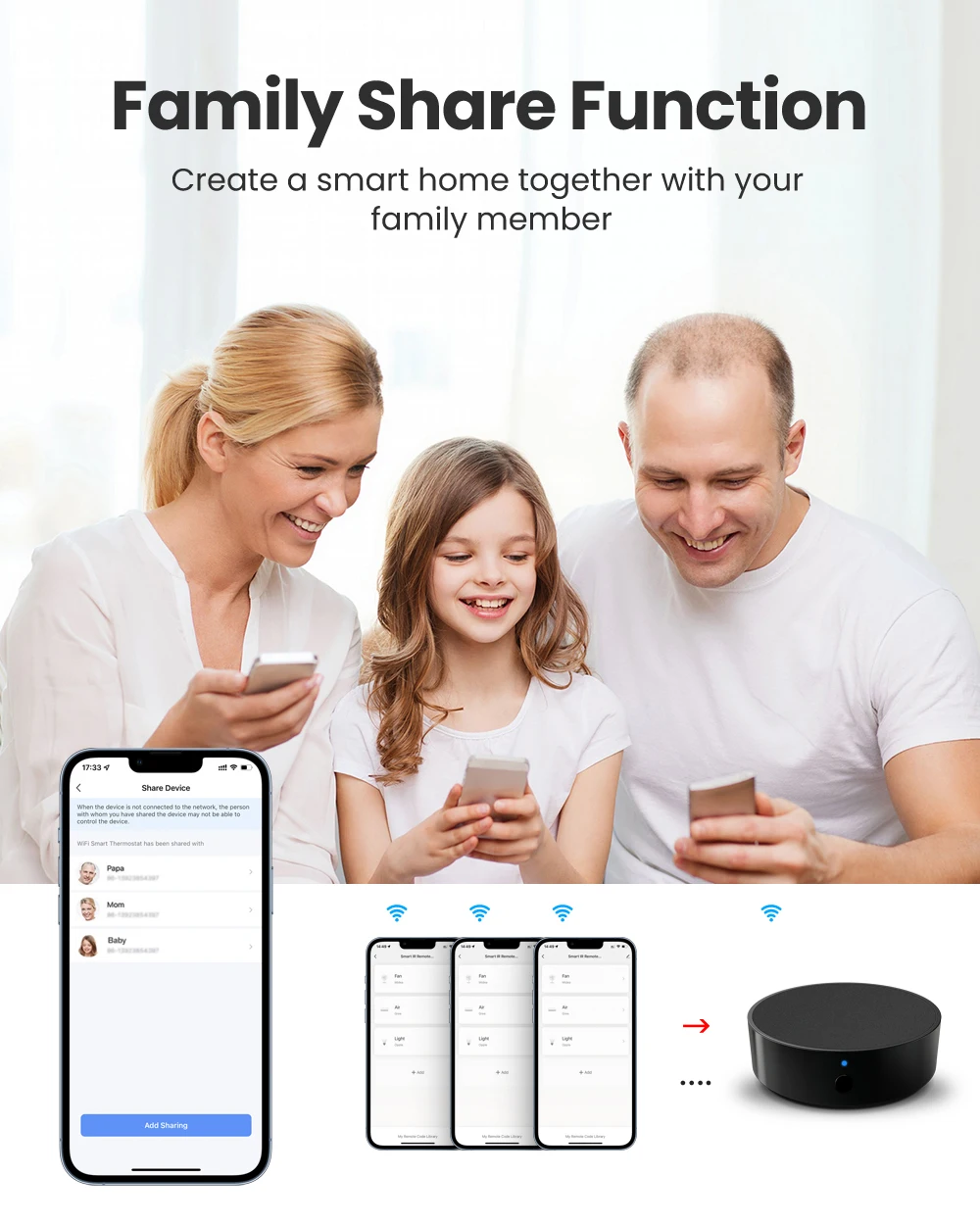 [Função de compartilhamento familiar] --- Você pode compartilhar o controle remoto com sua família com direito limitado, criar uma casa inteligente junto com seu familiar.